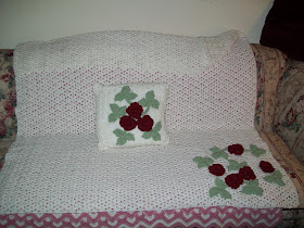 This is what I made for the Afghan Exchange. I love it. It took the better part of 3 pounders of soft white, 1 skein of Deep Burgundy and 1 skein of Soft Sage. I decided to do a pillow with it as well since I had a pillow form just sitting here yearning to be used!!! LOL She has received it so I can post the pic now! It is queen size which is bigger than the requirement, but I just couldn't see sending a small one, not my style and she didn't have any little ones, so she needed an adult size for sure.