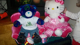 We had a wonderful day... Their Mamma and I took them to build a bear and Both of them got to pick out a bear and got to build it... HOW FUN! They really make a big deal out of these darn bears! The kids had a blast! My older sister came too and we had Lunch at VRC, had loads of fun playing at the kids area, came home and had a beautiful french vanilla bean cake from PC Market... Absolutely DELICIOUS cake! Gorgeous to boot! But here is the cake and the bears the babies built.....Michael picked out the blue peace bear and Shaylee picked the hello kitty (my fav!!!!) Sorry, the only pic of the cake is blurry!